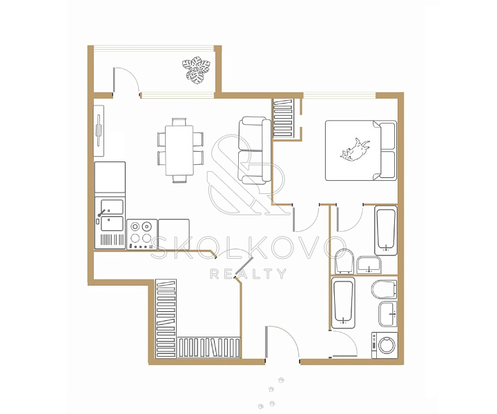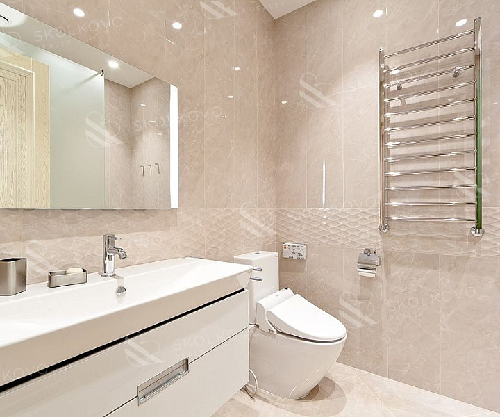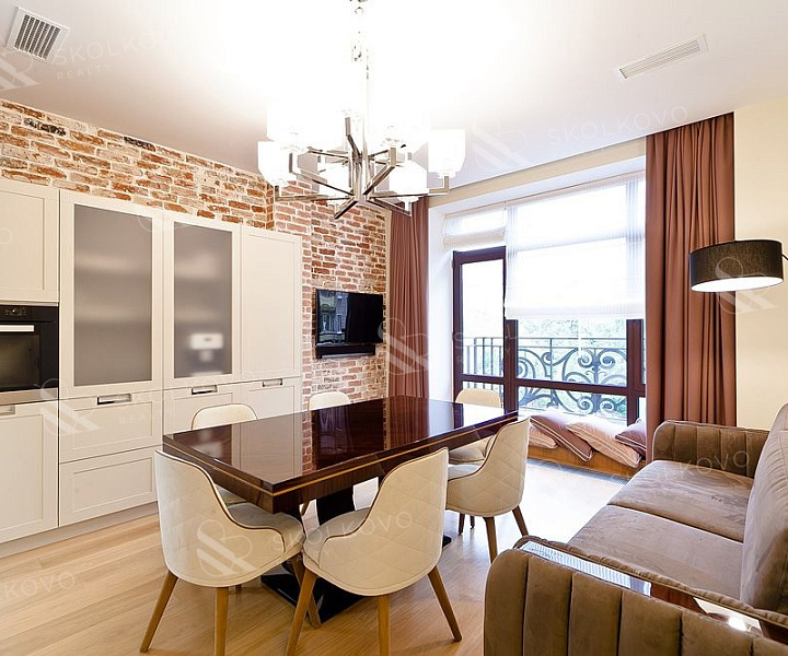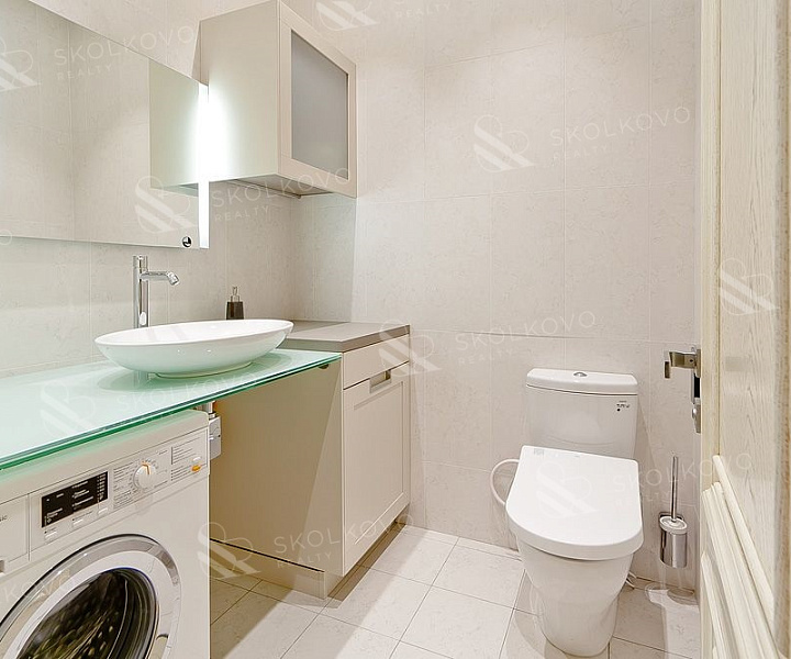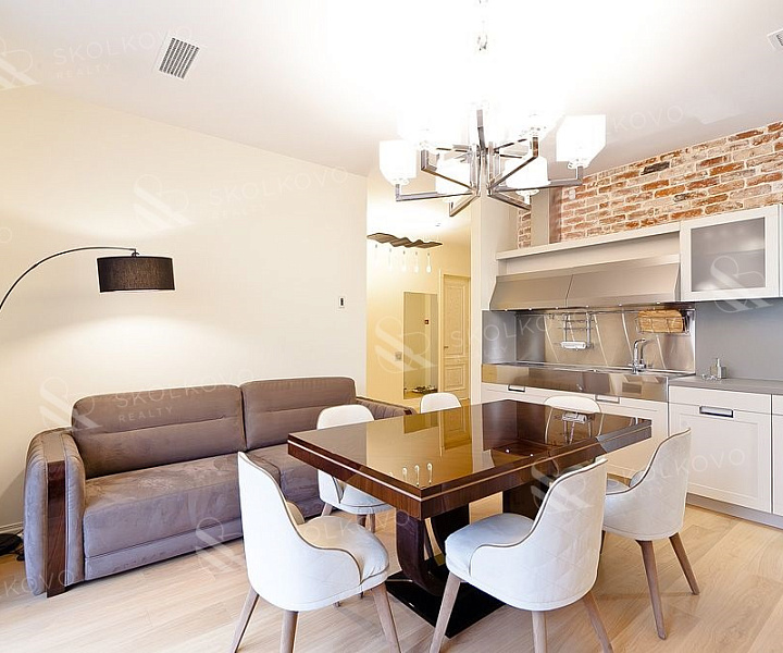 Функциональная планировка включает в себя светлую гостиную с зоной столовой и современной кухней, уютную спальню, два современных санузла, гардеробную и вестибюль. Дизайнерская мебель гармонично дополняет интерьер, создавая атмосферу стиля и комфорта. Кухня оснащена высококачественной техникой Miele, а ванных комнатах установлена японская сантехника Toto, известная своим высоким качеством.