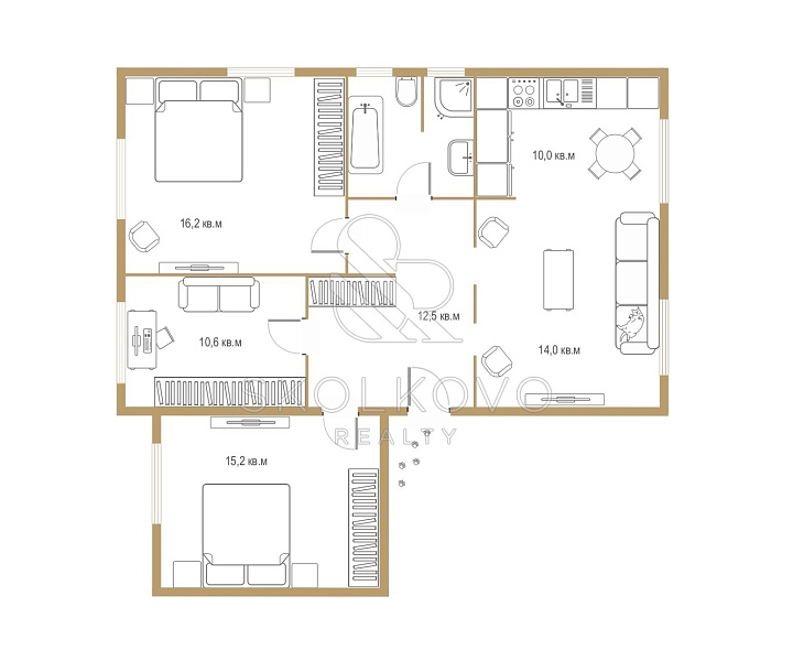 Планировочное решение: просторная прихожая зона, кухня- гостиная, две изолированные спальни, кабинет, санузел с душевой и ванной