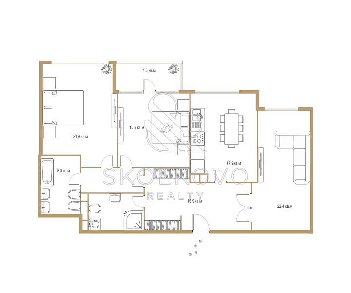 ПЛАНИРОВОЧНОЕ РЕШЕНИЕ: кухня-гостиная-столовая, 2 спальни, гардеробная, 2 с/у, постирочная.