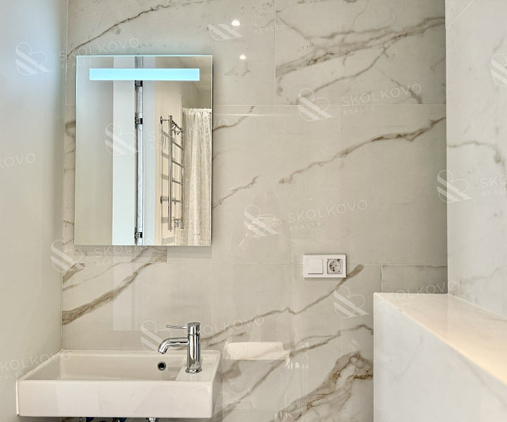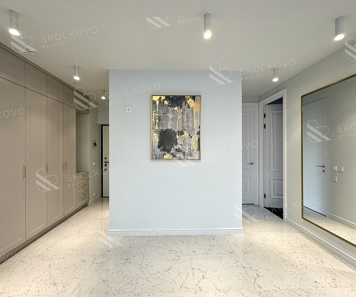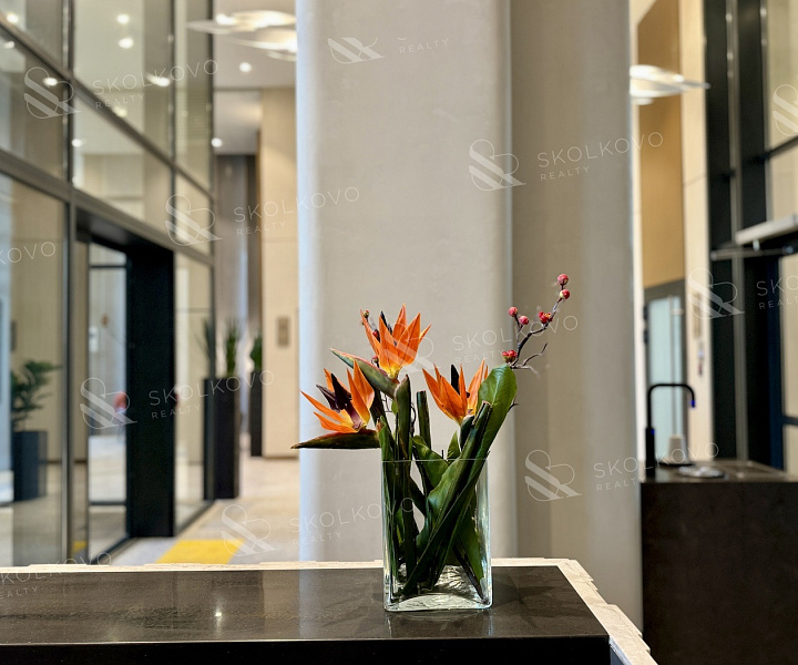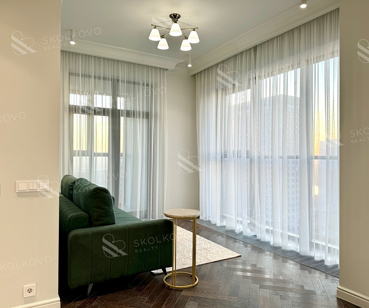 Максимально светлая благодаря большим окнам в пол! Есть также система "умный дом", теплый пол и центральная система кондиционирования с датчиком температуры и влажности воздуха.