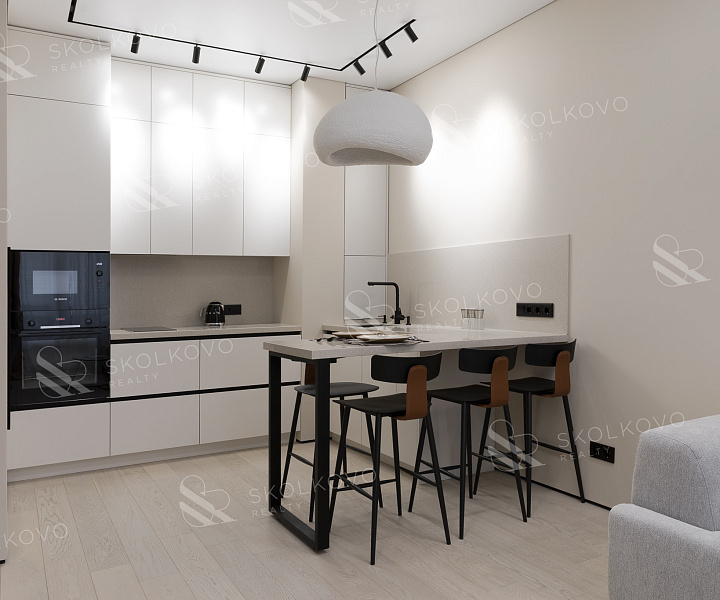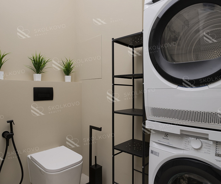 Стиральная и сушильная машины Electrolux, кухонная техника (встроенный духовой шкаф, встроенная микроволновая печь, встроенная варочная панель, встроенная посудомоечная машина) Bosch, встроенный холодильник Hair, телевизор Samsung.