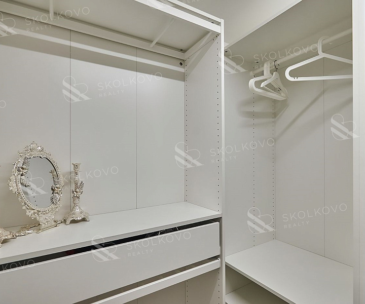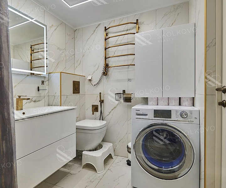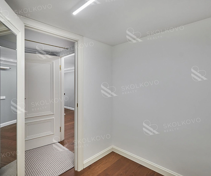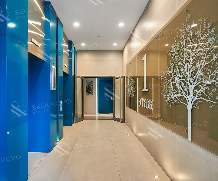 В квартире выполнен дизайнерский ремонт в стиле хай-тек с авторской отделкой, которая использует натуральные материалы, такие как мрамор и дерево. Высота потолков составляет 4,5 метра, а большие панорамные окна наполняют пространство светом. Оригинальное дизайнерское освещение с функцией диммирования создает уютную атмосферу в любое время суток.