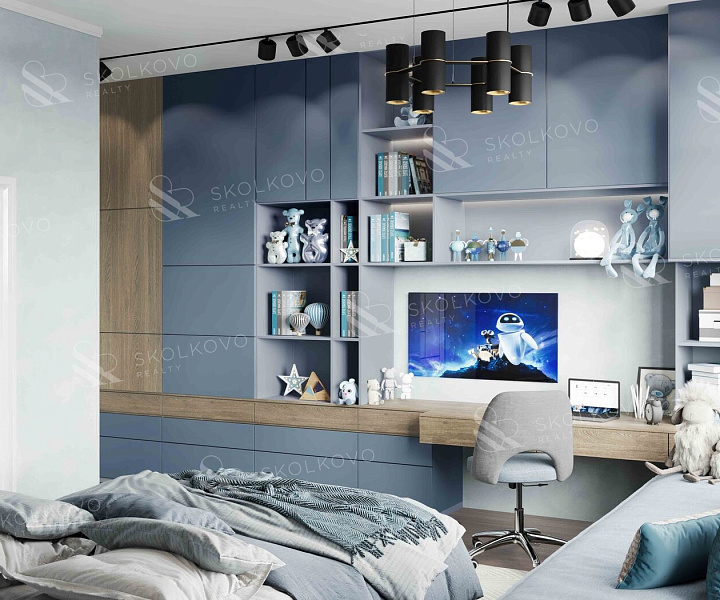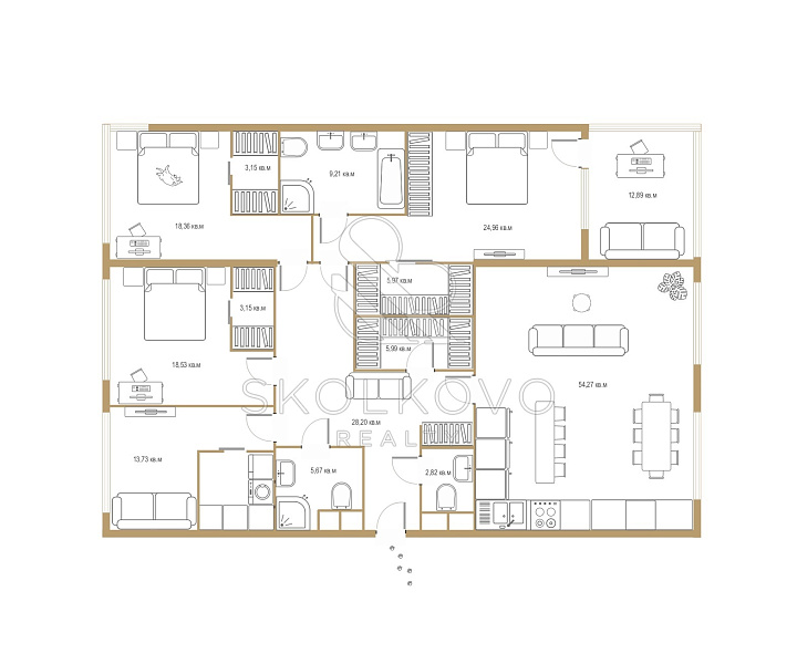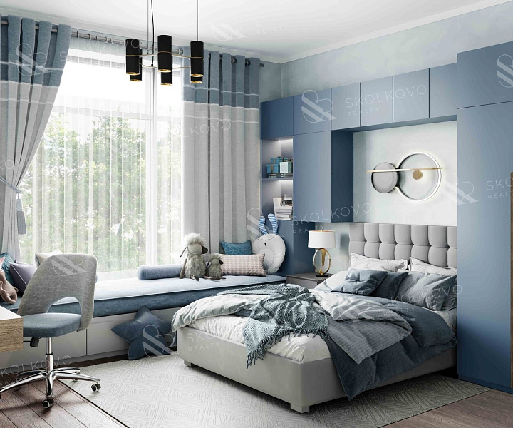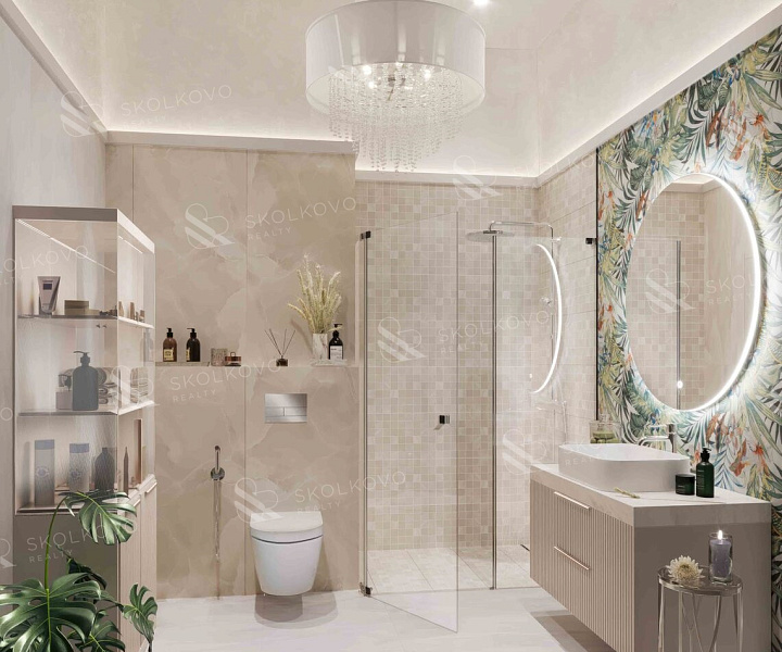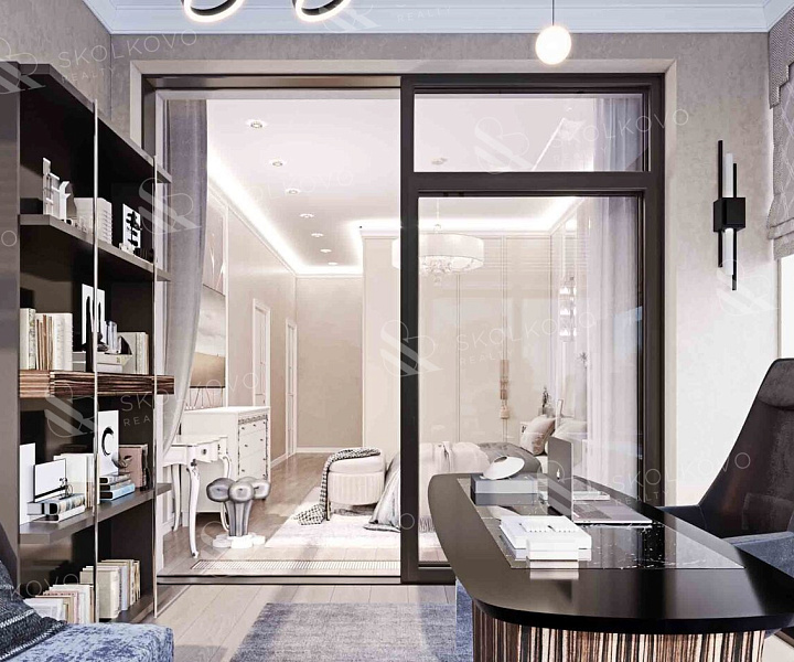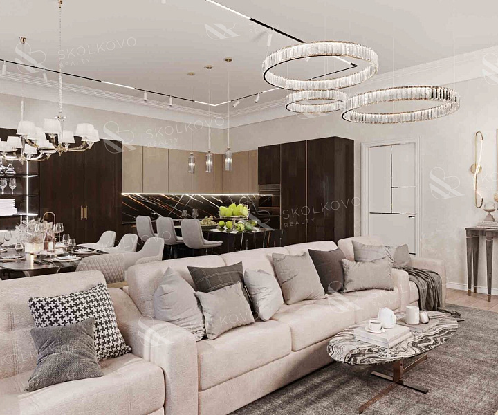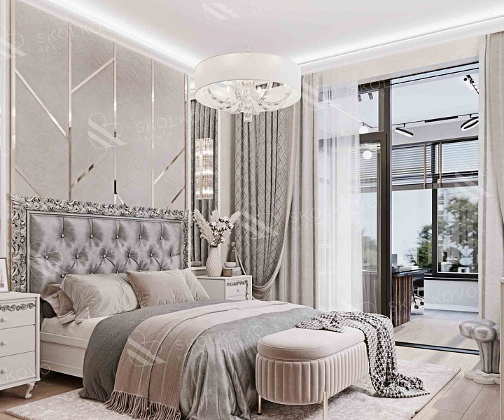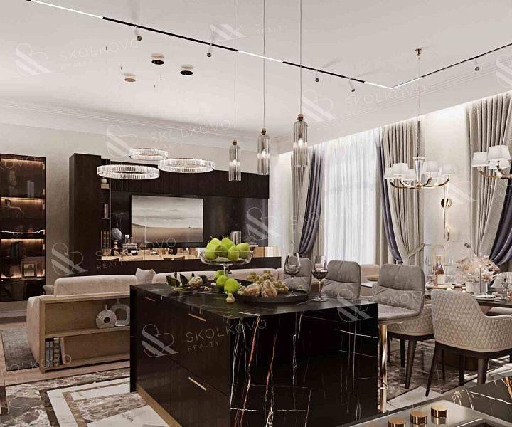 Удачная планировка включает: просторную гостиную, кухню-столовую, три спальни с собственными ванными комнатами и гардеробными, кабинет и гостевой санузел.