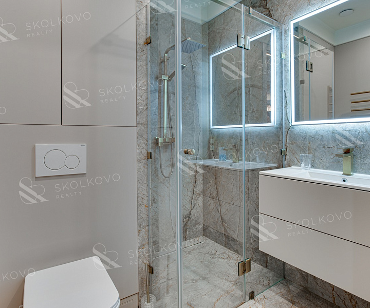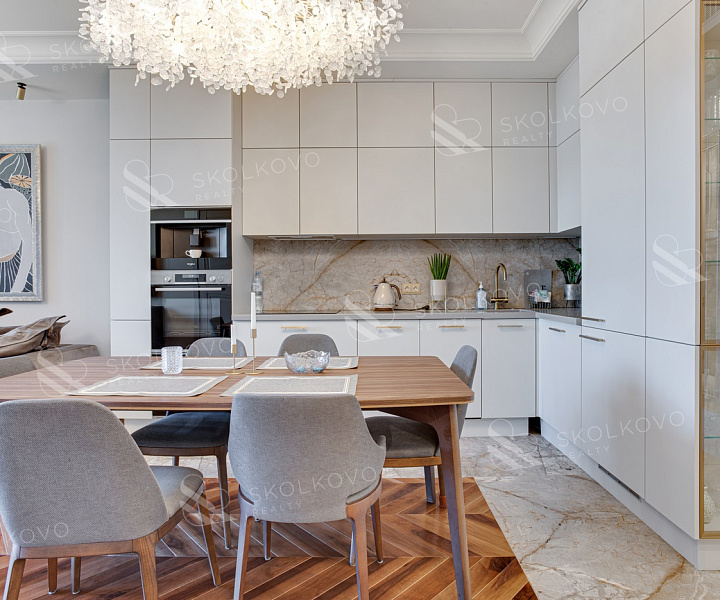 Эти апартаменты обладают идеальной планировкой, включающей уютную кухню-гостиную, две светлые спальни, встроенную гардеробную, два санузла и постирочную. Кухонный гарнитур оснащен техникой от брендов Bosch и Whirlpool, включая посудомоечную машину, духовой шкаф и винный шкаф.