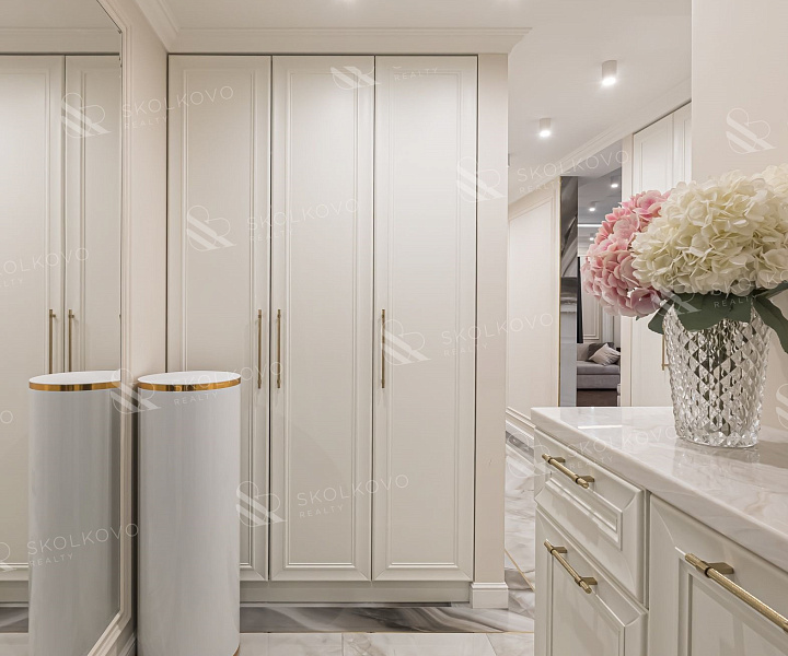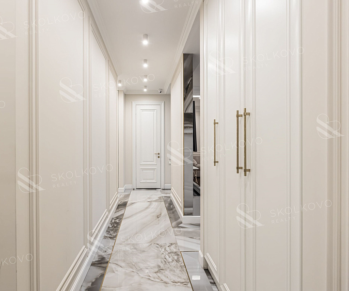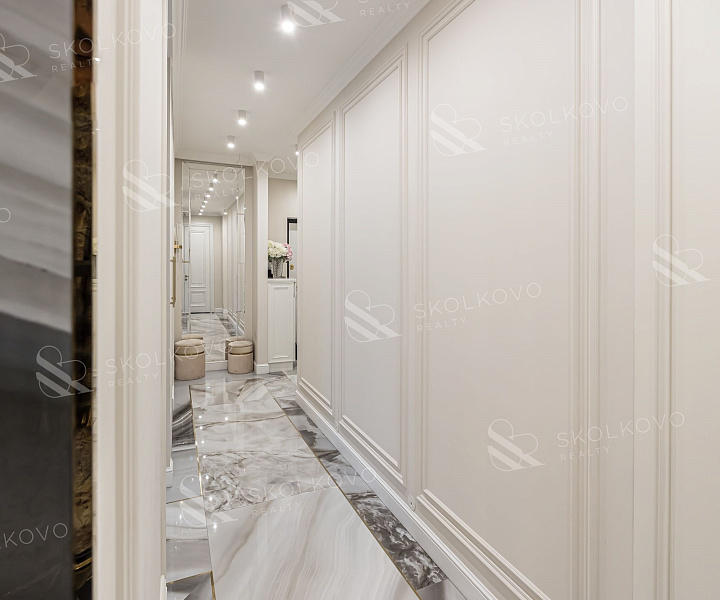 Полы выложены паркетной доской в форме французской елки и плиткой, а стены украшены декоративными молдингами.