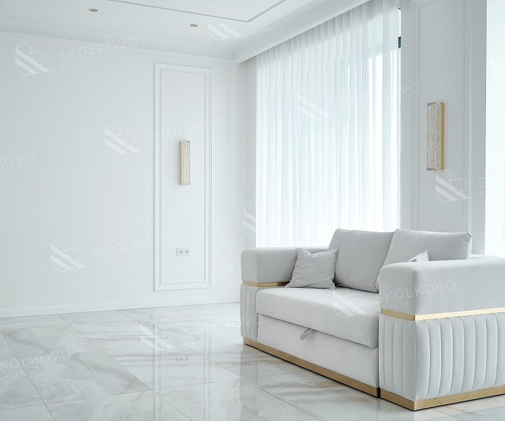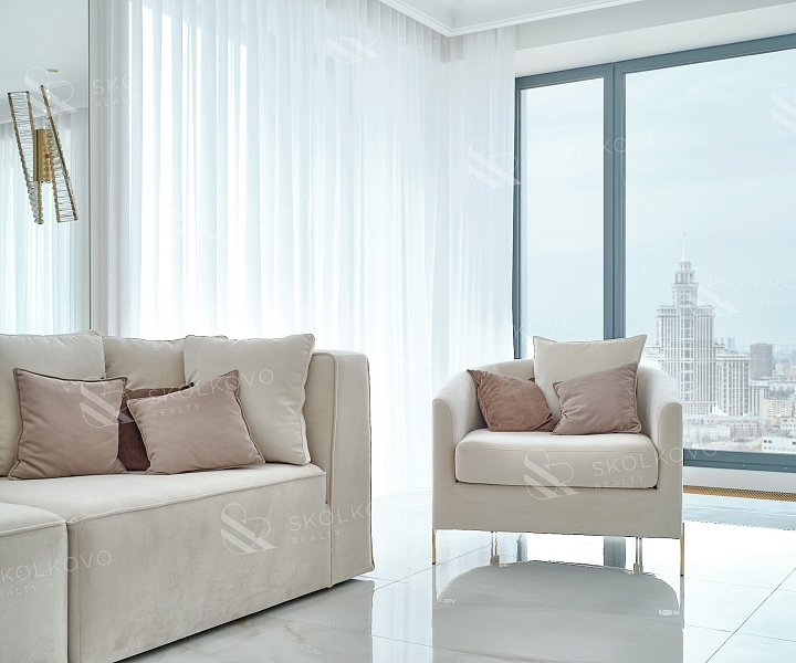 Панорамные окна наполняют пространство естественным светом, предлагая потрясающие виды на современный архитектурный шедевр — «Триумф Палас».