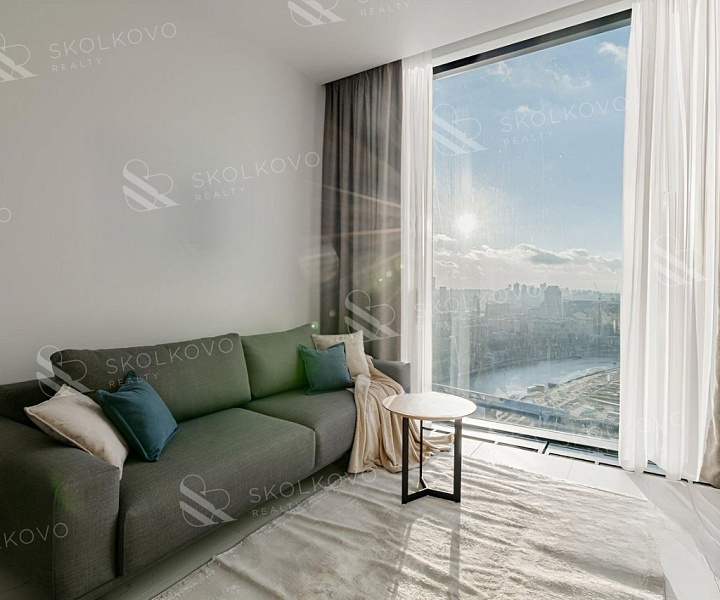 С окон квартиры открывается захватывающий панорамный вид на эффектный комплекс Moscow City, позволяя любоваться столичными пейзажами в любое время суток.