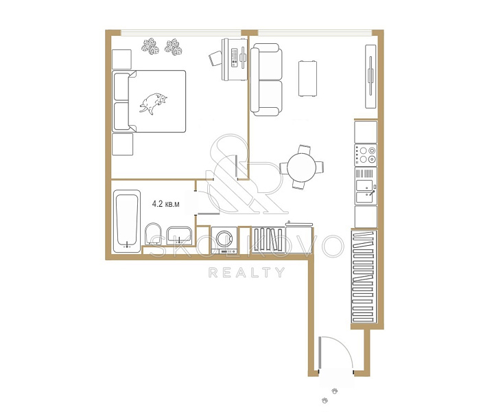 Планировка включает светлую гостиную, объединенную с кухней, уютную спальню и современный санузел, что создает атмосферу уюта и функциональности.