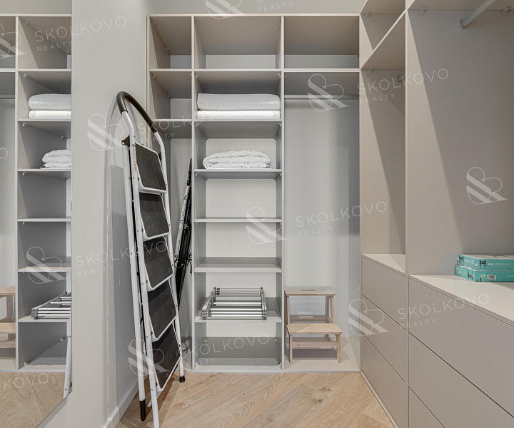 Просторная гардеробная с множеством вместительных шкафов предоставляет достаточно места для хранения одежды и аксессуаров.