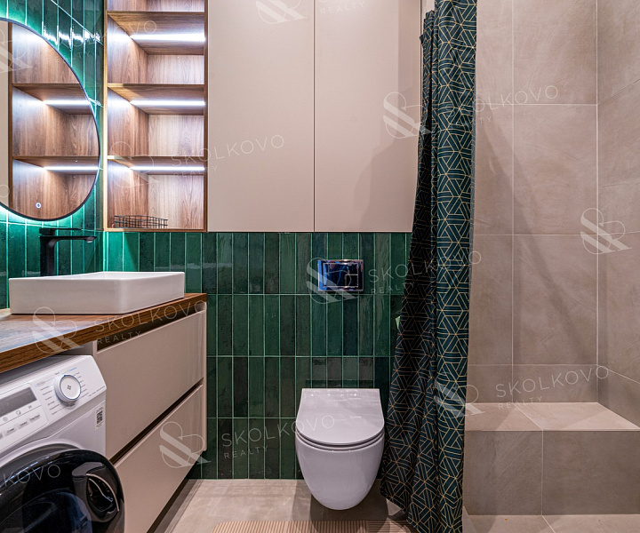 Современный санузел с душевой кабиной оборудован отличной стиральной машиной с функцией сушки, а также бойлером для обеспечения горячей воды даже в летний период.