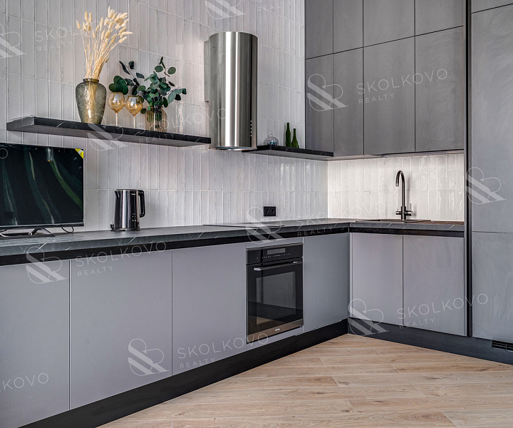 Открытая кухня-гостиная – сердце квартиры, оборудованная встроенной бытовой техникой, включая посудомоечную машину, духовой шкаф, микроволновую печь, вытяжку и варочную панель.