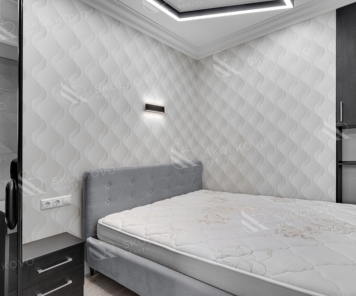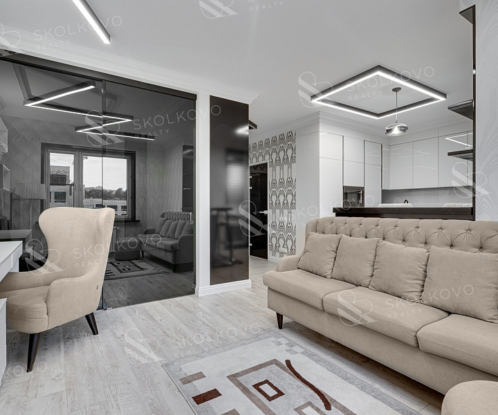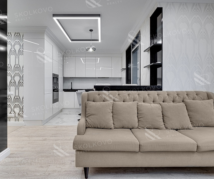Общая площадь квартиры включает в себя просторную кухню-гостиную с обеденной зоной, спальную комнату и раздельный санузел.