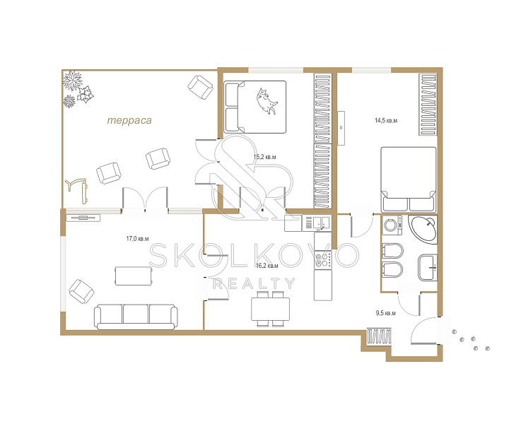 Эта светлая и уютная трехкомнатная квартира идеально подходит для комфортного проживания как с детьми, так и с домашними животными.