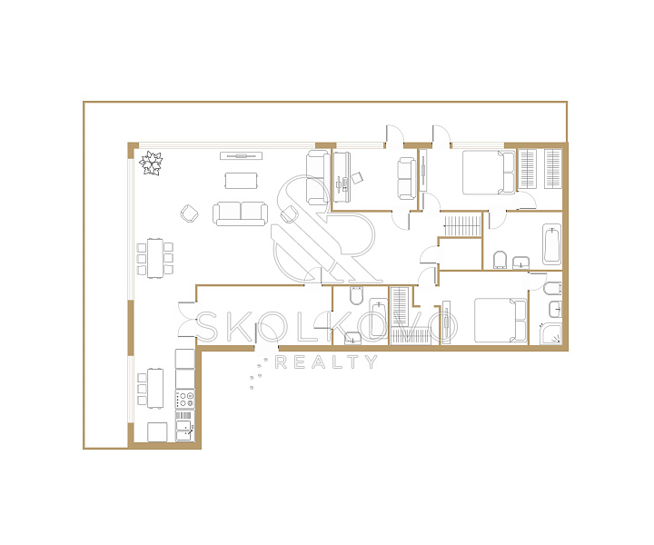 * 1 этаж: просторная гостиная с камином, современная кухня, 2 спальни с собственными санузлами и гардеробными, кабинет, прачечная и гостевой санузел.