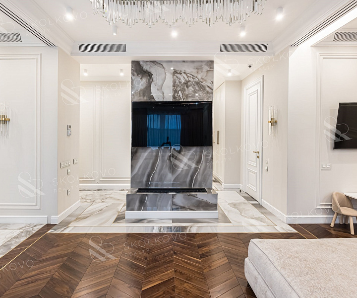 Полы выложены паркетной доской в форме французской елки и плиткой, а стены украшены декоративными молдингами.