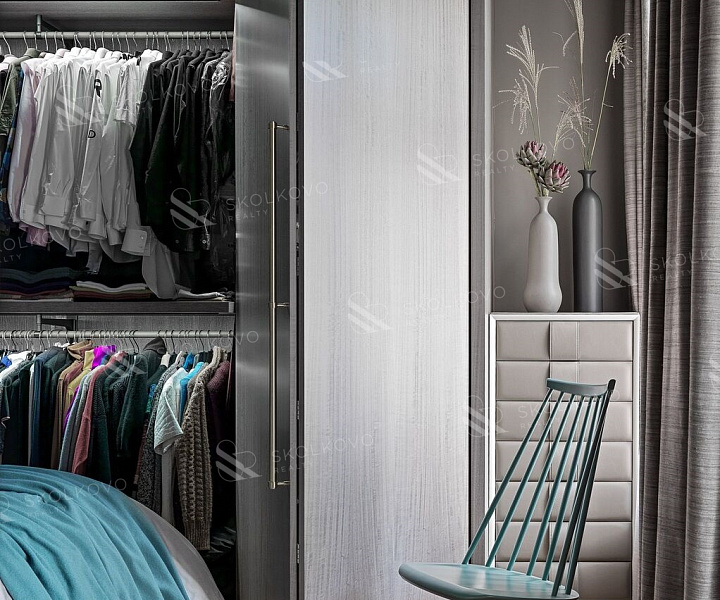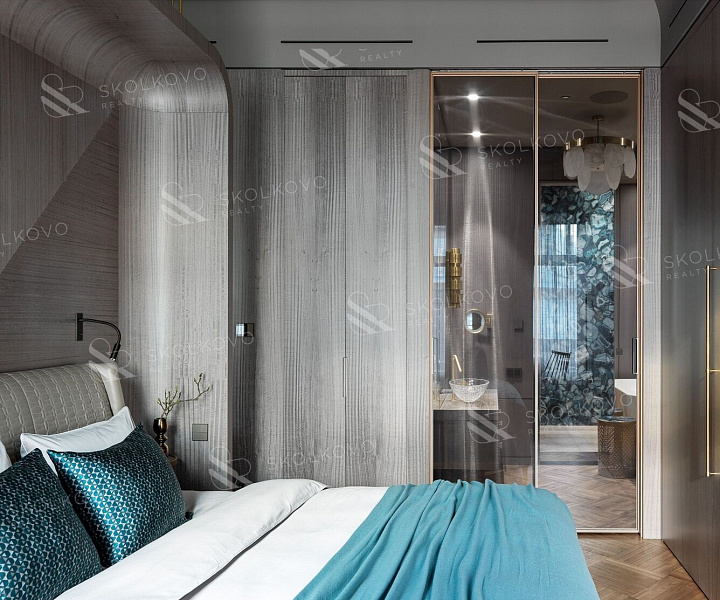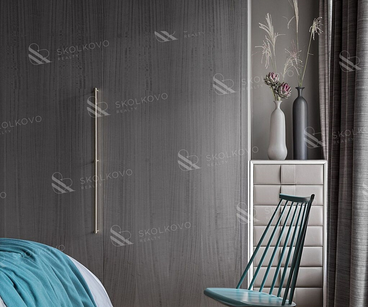 Перегородка между спальней и гостиной облицована тонированным в серый цвет шпоном эвкалипта, придавая помещению изысканность.