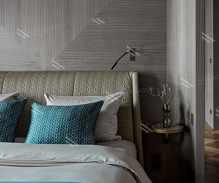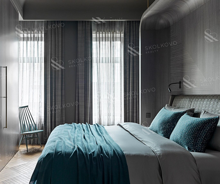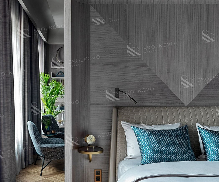 Шторы из ткани Armani Casa, кровать от Poltrona Frau и постельное белье от Atelier Tati добавляют роскошные акценты и создают атмосферу комфорта.
