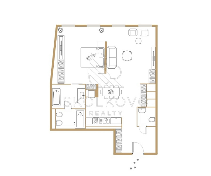 Латунные крепления перегородки расположены органично и имеют разнообразный диаметр, создавая стильный акцент в интерьере, перекликаясь с дизайном светильников в зоне гостиной.