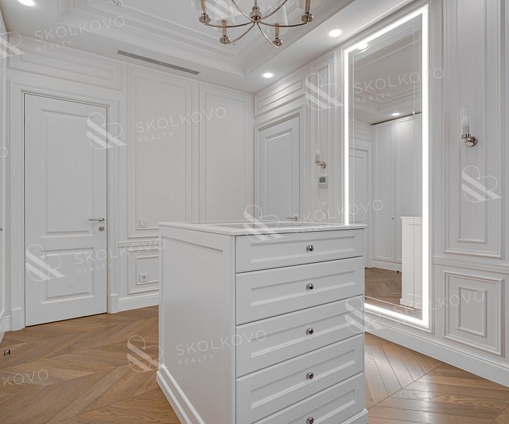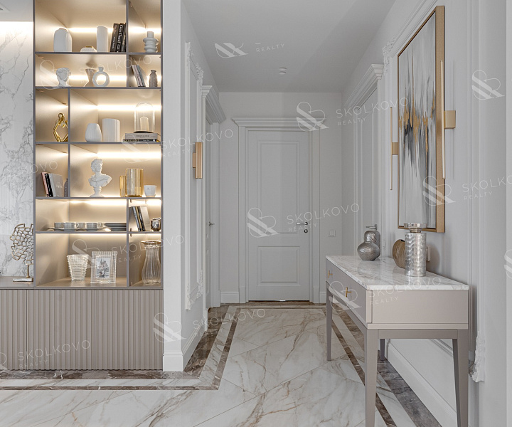 Декоративная лепнина и латунные элементы для подчеркивания классического стиля.