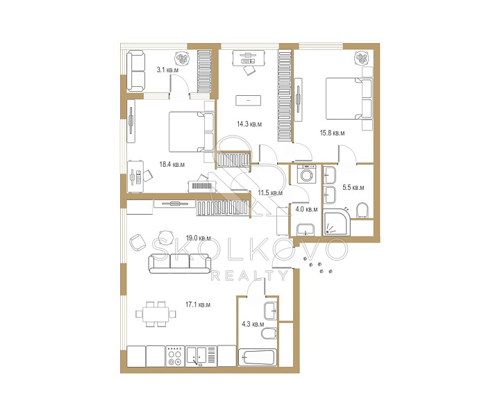 Эта просторная и функциональная квартира с продуманной планировкой включает в себя: