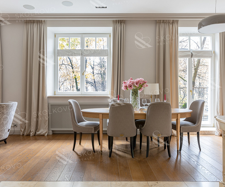 Высота потолков 3,2 метра добавляет атмосферу легкости и свободы, а балкон в гостиной открывает захватывающий вид на живописный Патриарший пруд.
