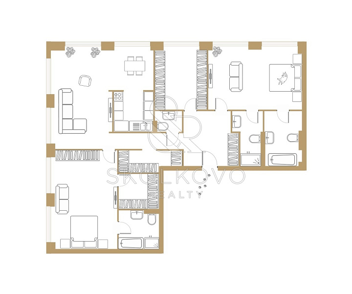 Две спальни, каждая из которых оборудована собственными санузлами и гардеробными, обеспечивая максимальный комфорт и приватность.