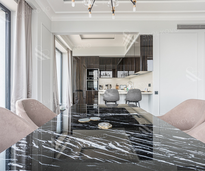 Эта квартира с захватывающими видами на Ходынский бульвар и "Триумф-Палас" выполнена в авторском дизайнерском ремонте в стиле Classic dark и оснащена премиальными материалами, которые создают атмосферу роскоши и уюта.