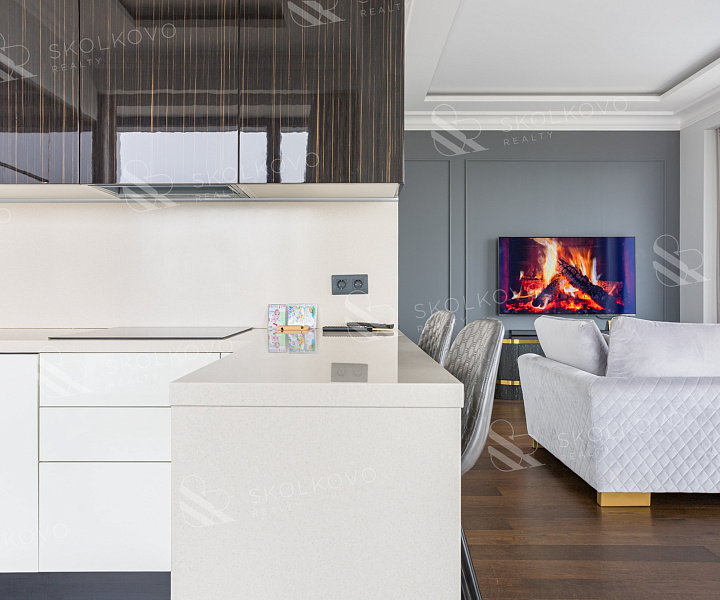 Панорамное остекление наполняет квартиру естественным светом, подчеркивая великолепие интерьера.