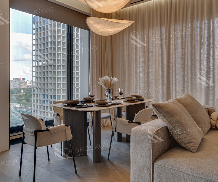 Квартира с панорамным остеклением открывает лучшие виды на город. В непосредственной близости находятся Петровский парк для прогулок, ВТБ Арена для спортивных событий, а также крупный торговый центр Авиапарк.