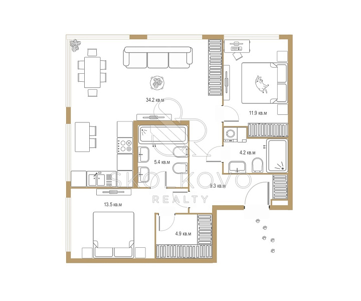 Спальни обставлены с учётом максимального комфорта — матрасы Grether&Wells Magnificent обеспечат вам крепкий сон.