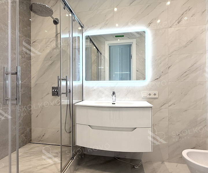 Современный санузел с высококачественной отделкой обеспечивает максимальный комфорт.