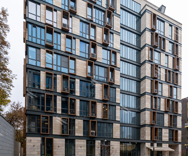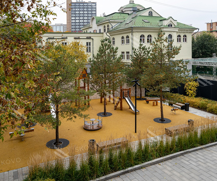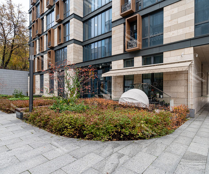 Закрытая и охраняемая территория комплекса включает уникальный ландшафт с арт-объектами и графичными дорожками, которые под вечер становятся особенно эффектными благодаря оригинальной точечной подсветке.
