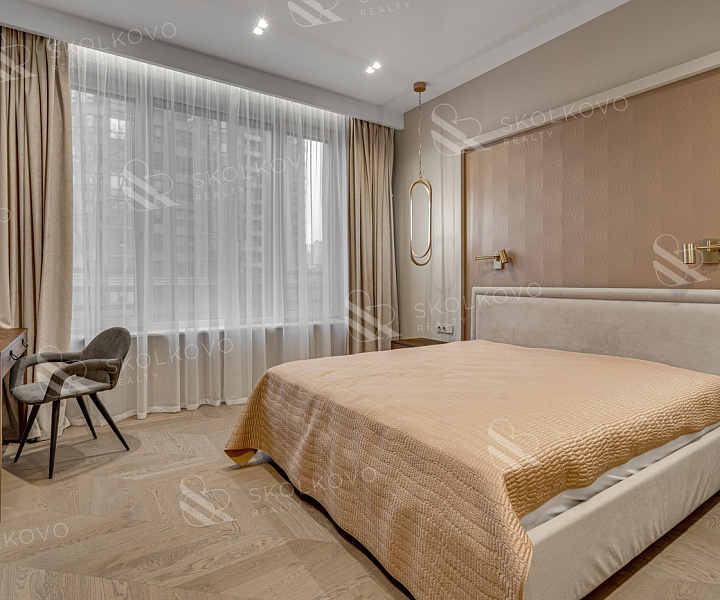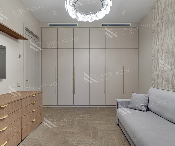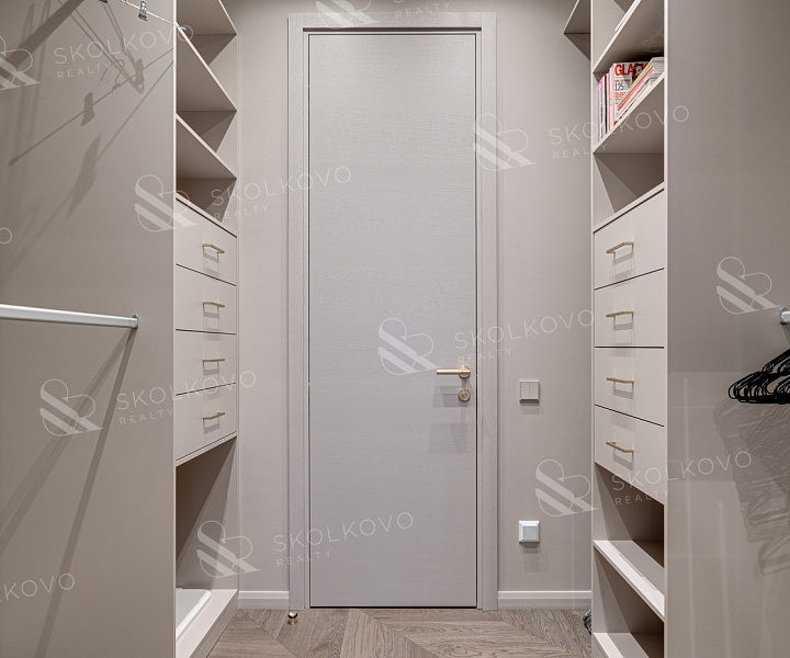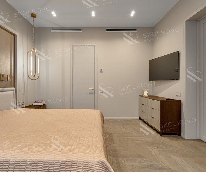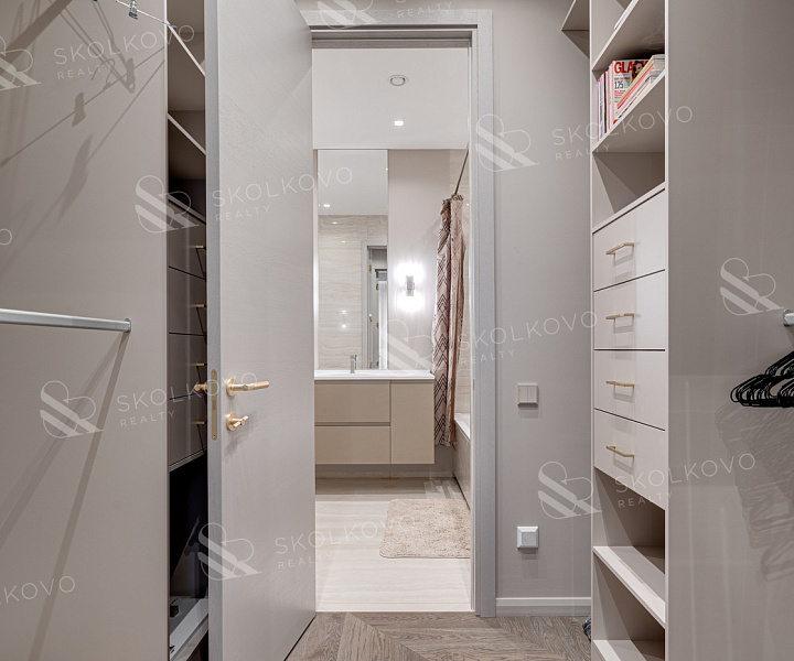 Мастер-спальню с гардеробной и отдельным санузлом, создающую уединение и комфорт.