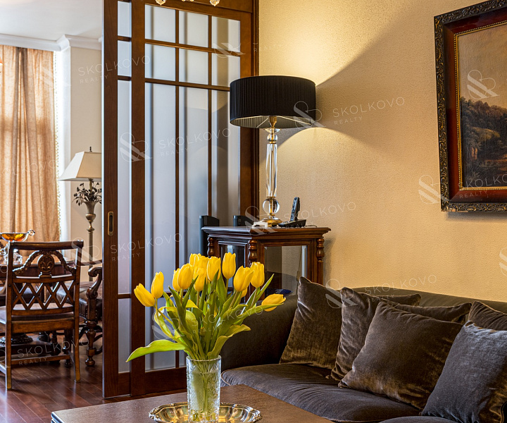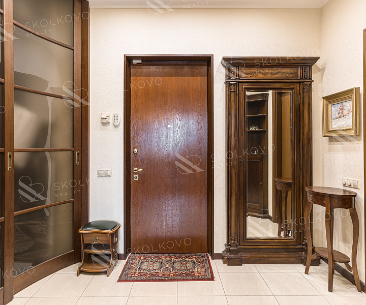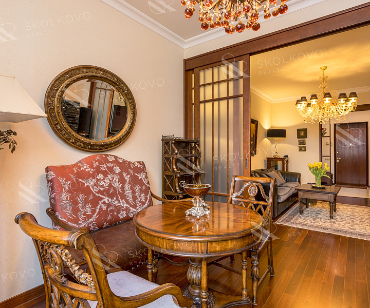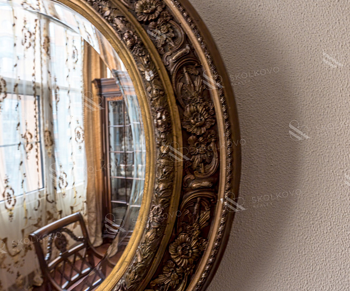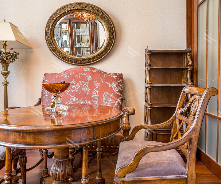Вся мебель изготовлена из массива высококачественных пород дерева, с антикварным зеркалом 19 века, добавляющим нотку истории в современный интерьер.