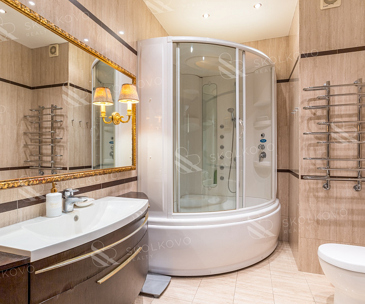 Душевой кабиной итальянской фирмы GLASS с джакузи и паровой баней, а также унитазом и биде от Villeroy & Boch.