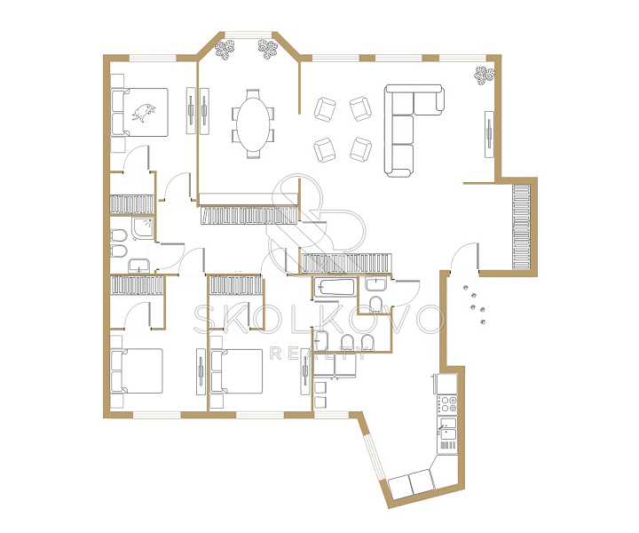 Два совмещенных санузла: С ванной и душевой кабиной, а также дополнительный гостевой санузел для ваших посетителей.