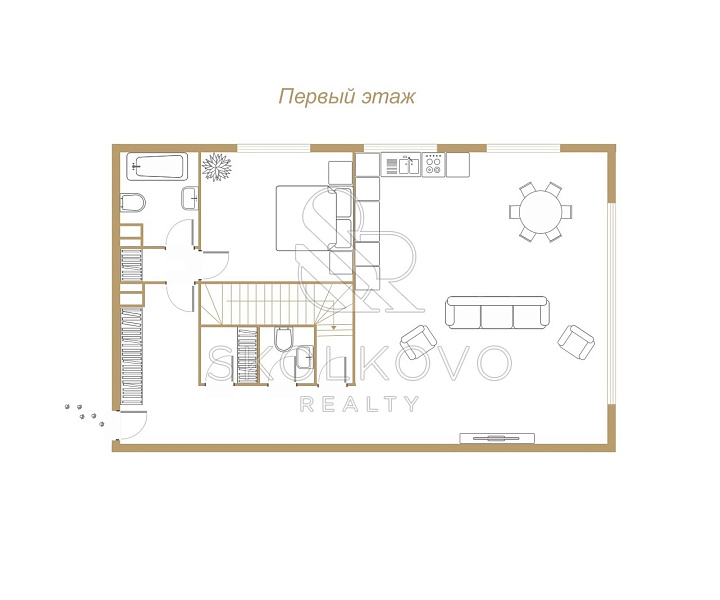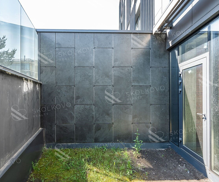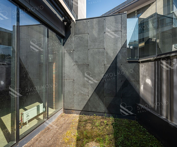 Площадь нижнего уровня составляет 96,1 кв.м и включает собственный внутренний дворик площадью 16,5 кв.м, оснащённый электрической маркизой для защиты от дождя и ветра.