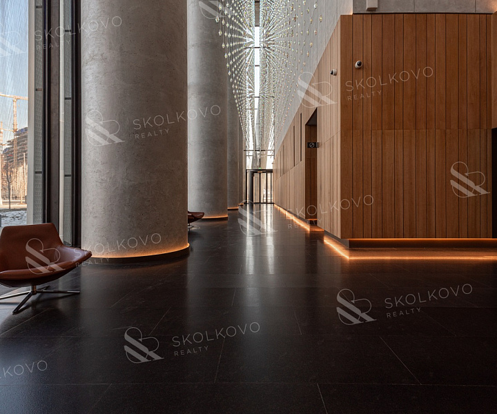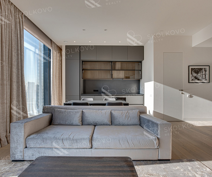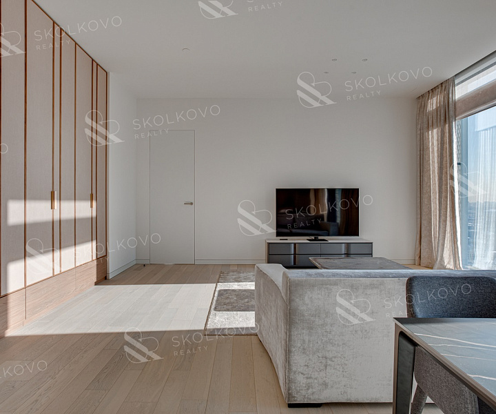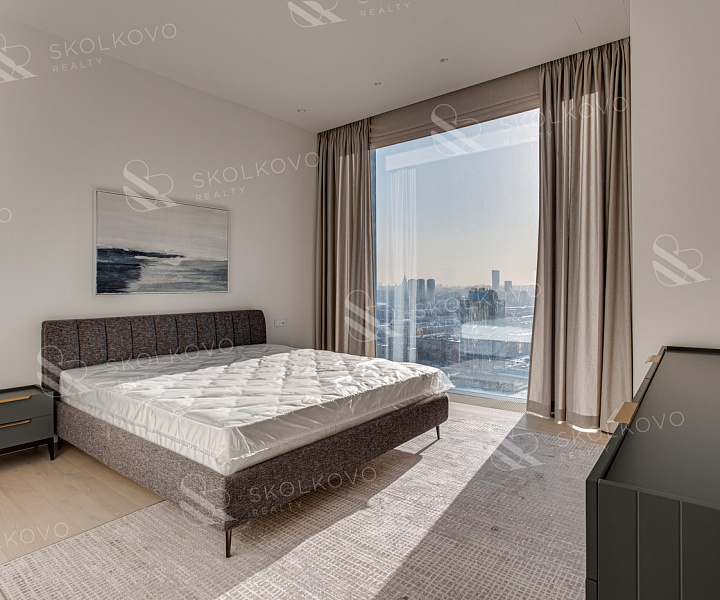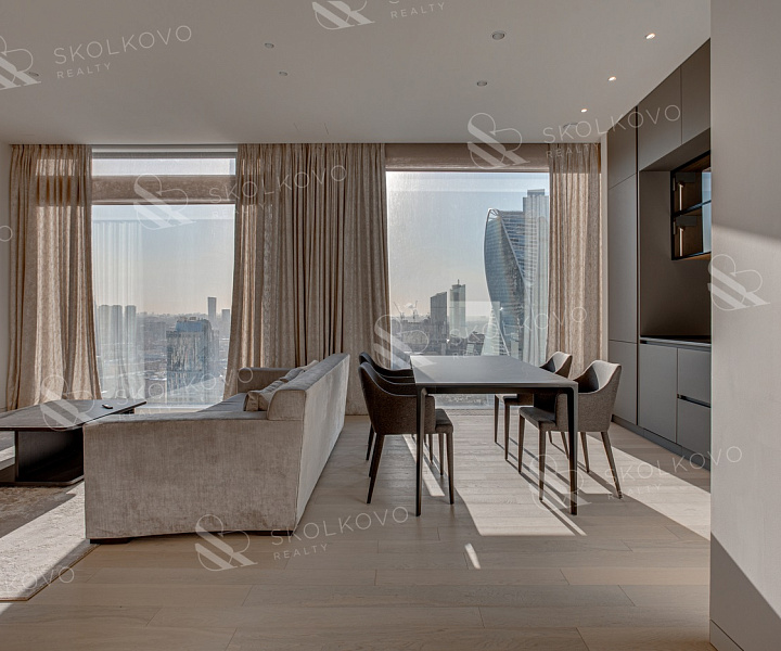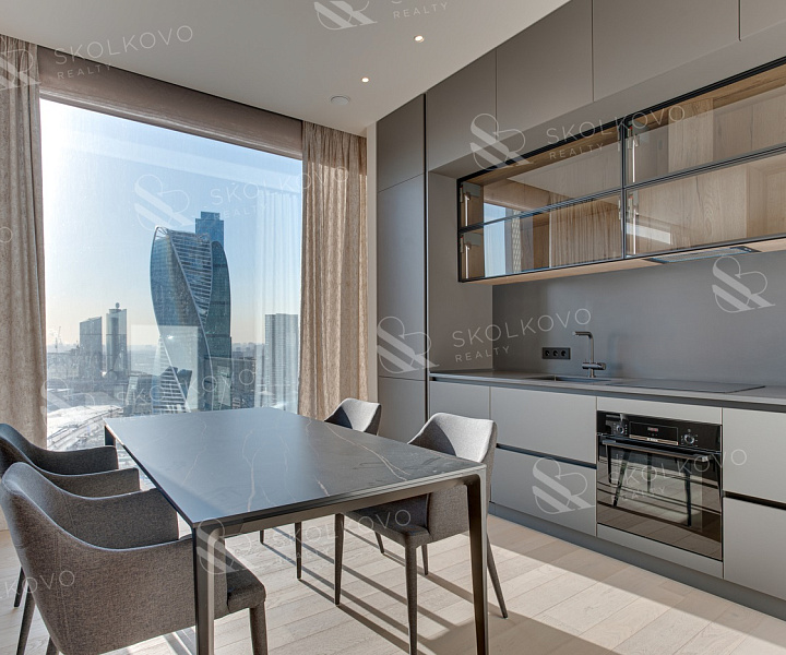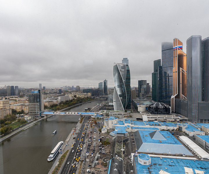 Завораживающие панорамные виды на Москву-реку и сверкающие башни "Москва-Сити" из широких панорамных окон от пола до потолка.