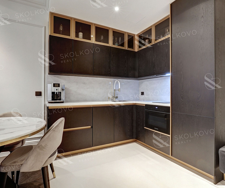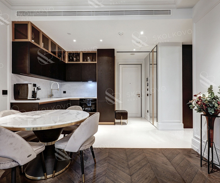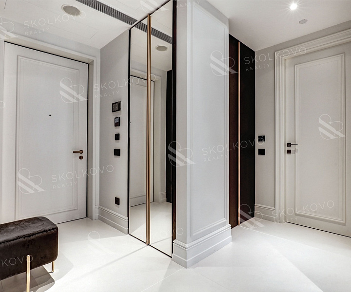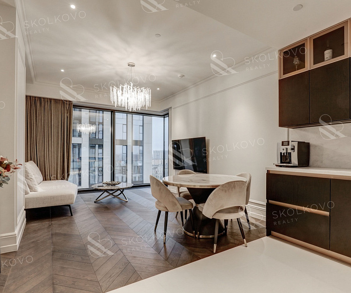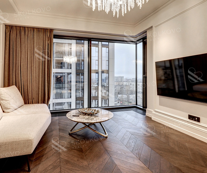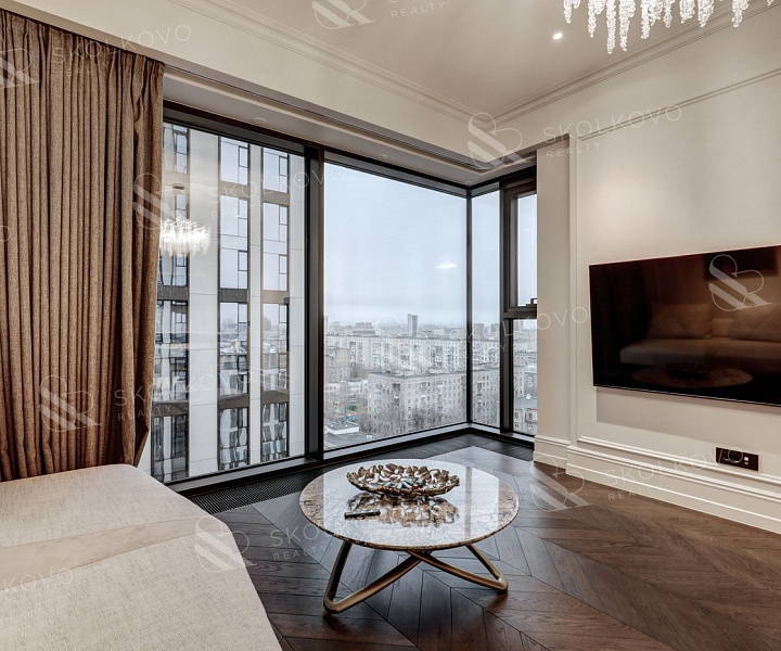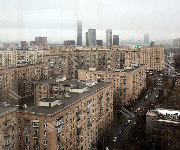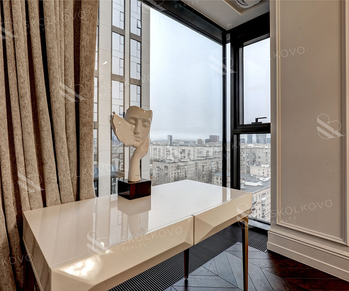 Благодаря панорамному остеклению пространство наполнено естественным светом, открываются живописные виды на город Москва Сити и на Кутузовский проспект.