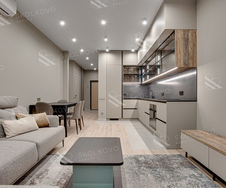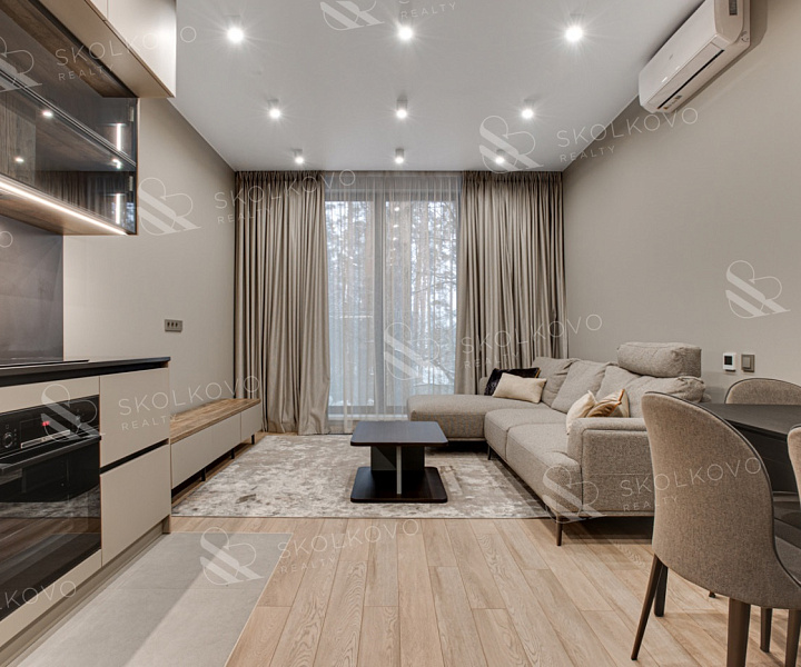 Планировка квартиры включает кухню-гостиную, спальню, гардеробную, совмещенный санузел, лоджию и прихожую. В квартире выполнен стильный дизайнерский ремонт высокого качества, установлена вся необходимая мебель и бытовая техника для комфортного проживания.