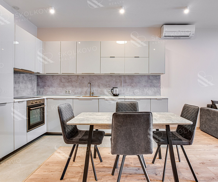 Квартира полностью меблированная и оснащена всей необходимой техникой для комфортного проживания. Кухня площадью 20 кв. м укомплектована современной техникой: холодильником, посудомоечной и стиральной машиной, а также кондиционером.