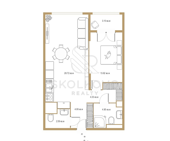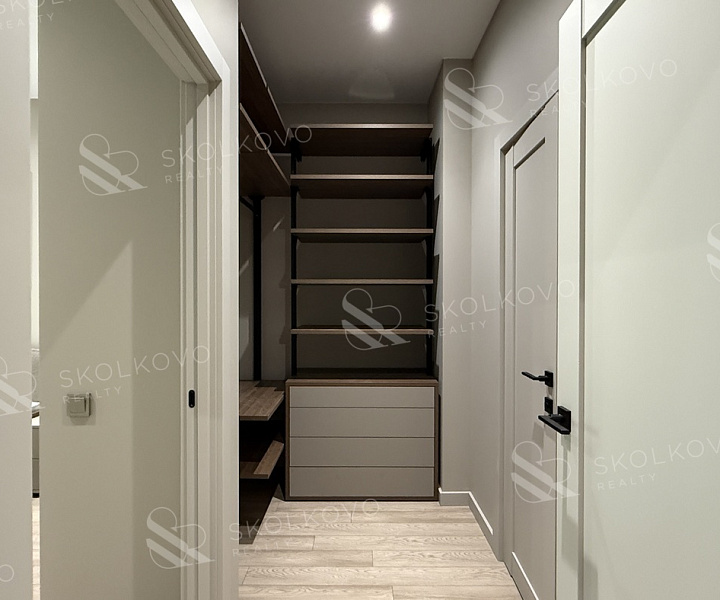 Планировка: кухня-гостиная, спальня, гардеробная, совмещенный санузел, лоджия, прихожая.