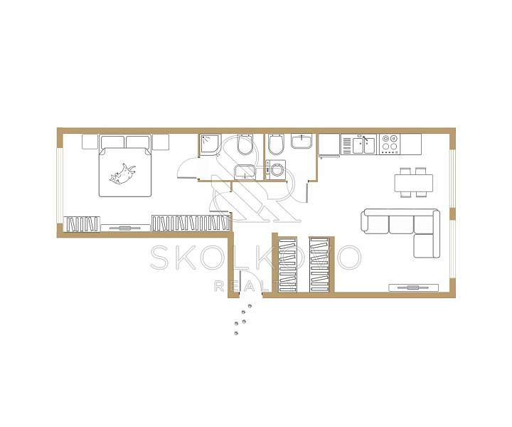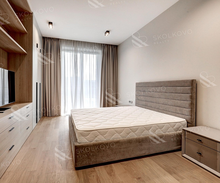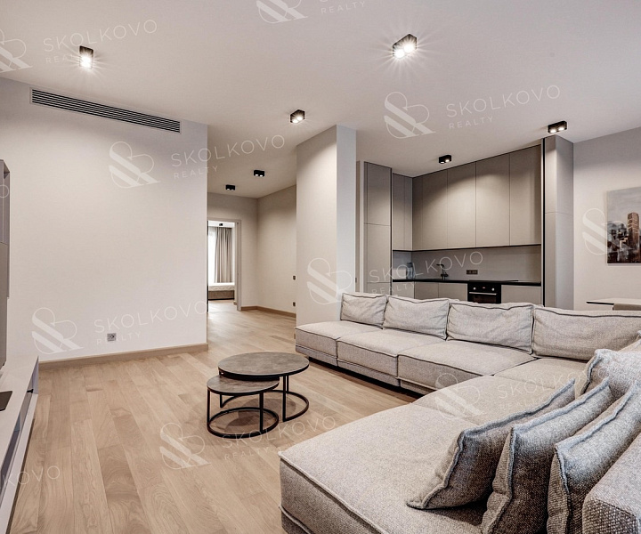 Площадь квартиры составляет 95 м² и включает удачно спроектированную планировку: просторную кухню-гостиную, уютную мастер-спальню, гардеробную и гостевой санузел.