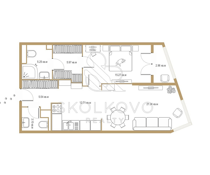 Планировка: кухня-гостиная, спальня, гардеробная, совмещенный санузел, лоджия, прихожая.