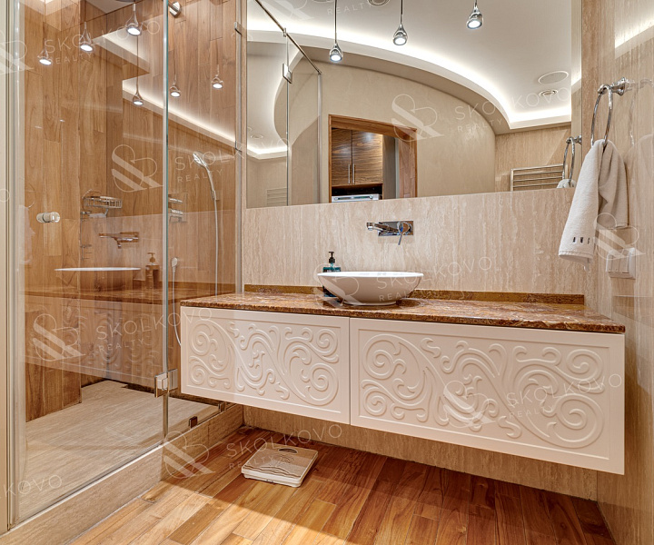 Роскошный тиковый пол в ванной комнате со сантехникой Villeroy & Boch.