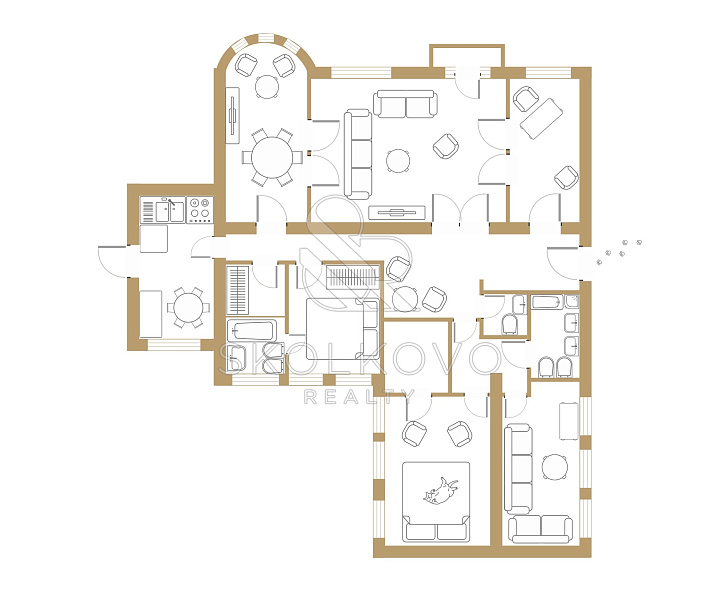 Планировка: Просторная гостиная, уютная кухня, 3 спальни, 3 ванные комнаты, кабинет и детская комната — идеальное пространство для комфортного проживания.