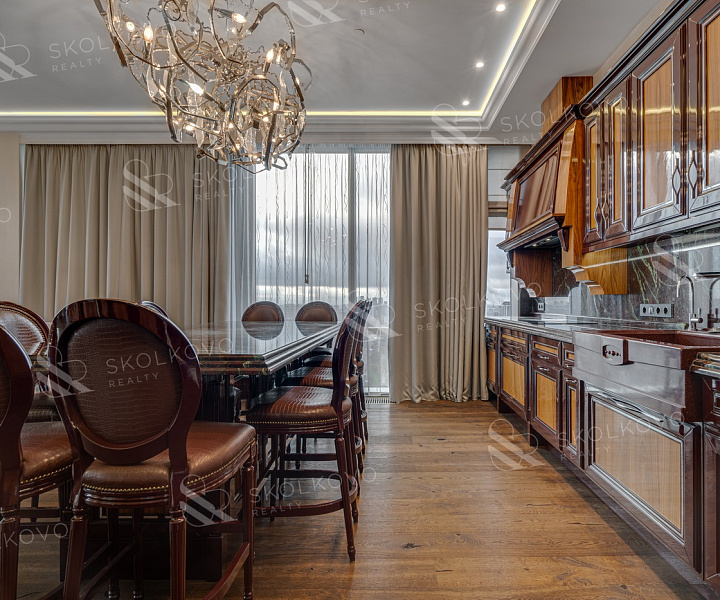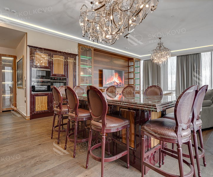В центре квартиры расположена великолепная кухня-гостиная, выполненная в гармоничном сочетании натуральных и элитарных материалов.