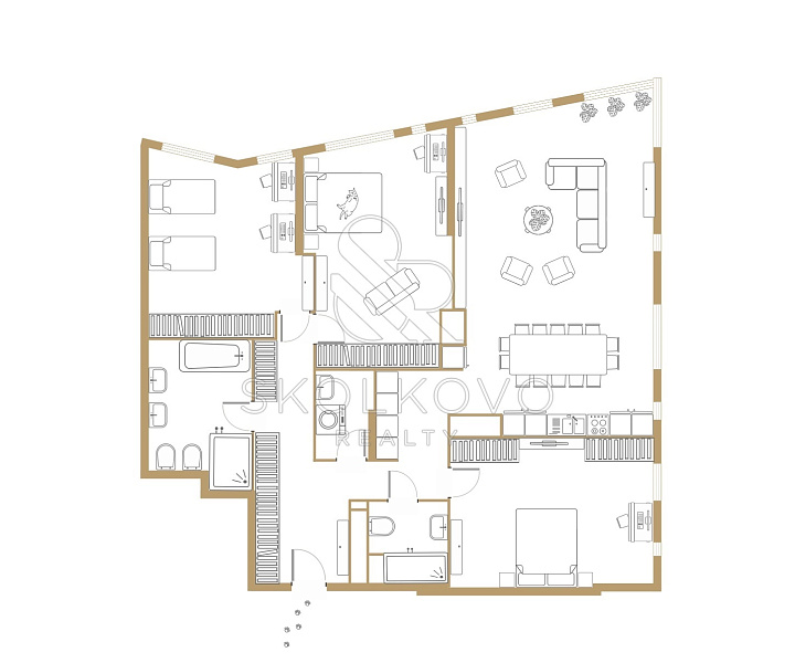 Комнаты: кухня-гостиная, две спальни, кабинет, два санузла, постирочная