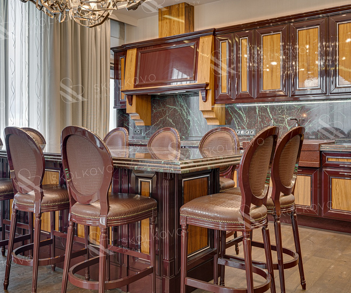 Итальянские барные стулья от фабрики Bakokko и премиальная немецкая встроенная техника Kueppersbusch обеспечивают не только эстетическое удовольствие, но и максимальную функциональность.