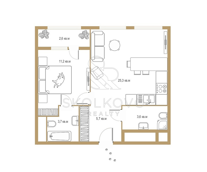 Планировочное решение: 1 спальня, кухня, объединенная с обеденной зоной и гостиной, 2 санузла.